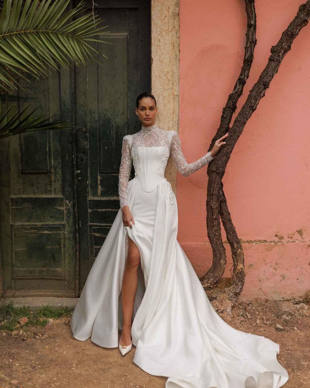 Odvojivi korzet sa širokom suknjom izrađen je od luksuznog mikada što unosi strukturu i moderan karakter u cjelokupan look. Korzet i suknja dolaze kao jedinstveni komad koji se nosi preko čipkaste haljine sirena kroja što osigurava savršeno pristajanje i naglašenu siluetu.