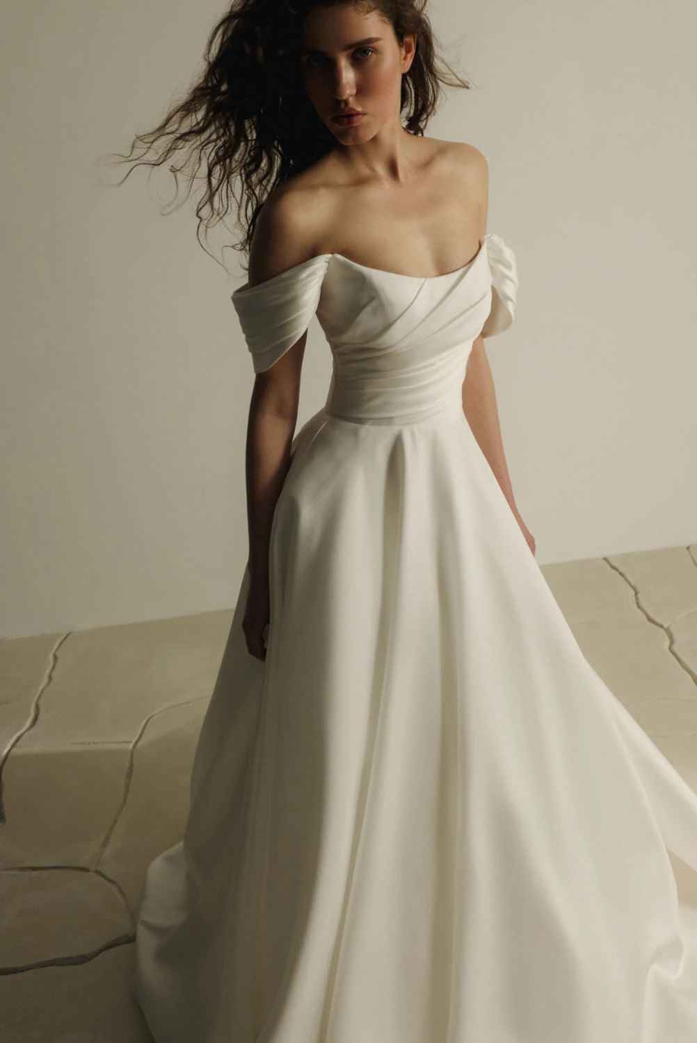 Ova vjenčanica ima raskošnu siluetu izrađena je od luksuznog mikada. Strukturirani gornji dio krasi nježno drapirani materijal, koja klasičnoj formi daje dubinu i dimenziju. Klasično vezanje na leđima osigurava savršeno pristajanje i dodatno naglašava struk.