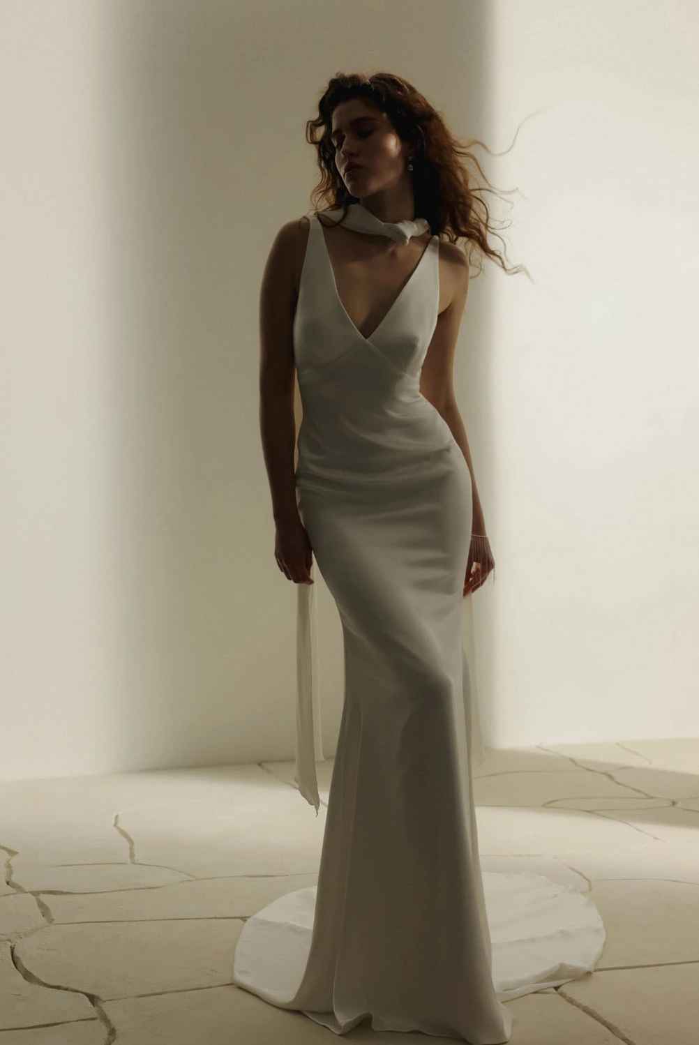 Izrađena od laganog satena koji nježno obavija tijelo, stvarajući čistu, profinjenu i besprijekorno elegantnu siluetu. Otvorena leđa donose suptilnu dozu senzualnosti i suvremenog šarma, dok diskretan šlep upotpunjuje izgled nenametljivom gracioznošću.