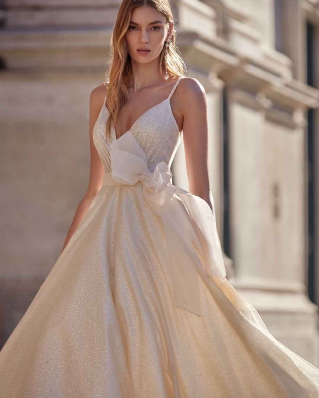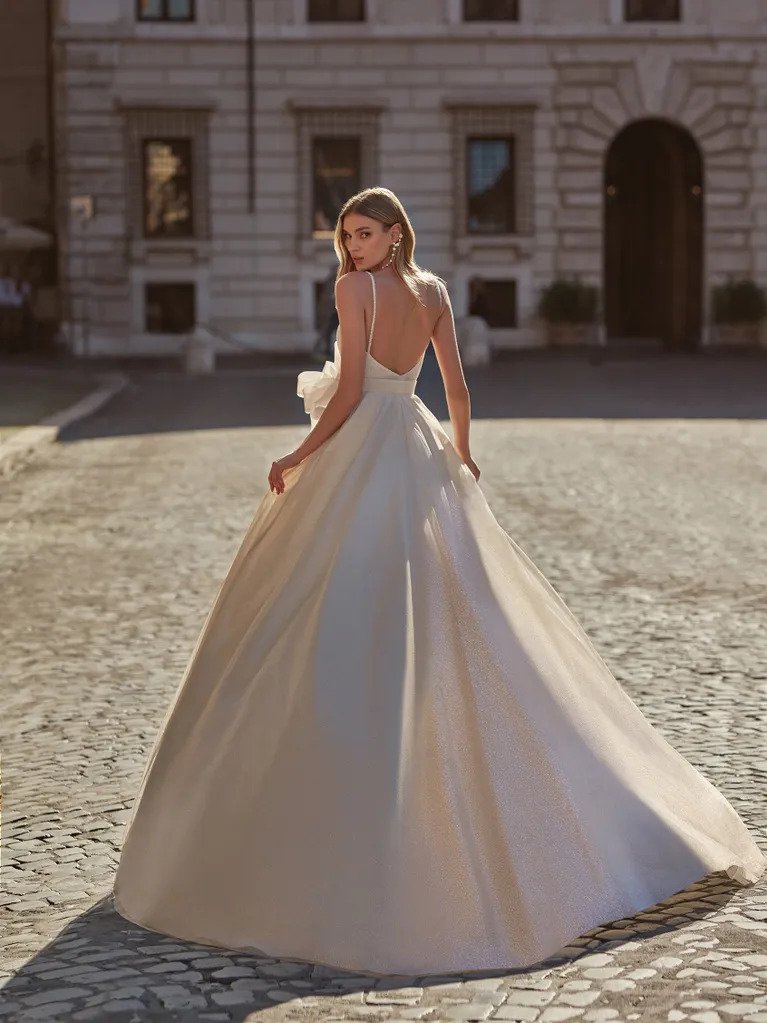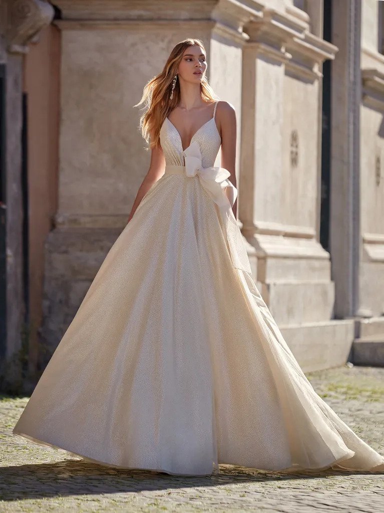 Vjenčanica A kroja s V izrezom izrađena od svjetlucavog materijala.