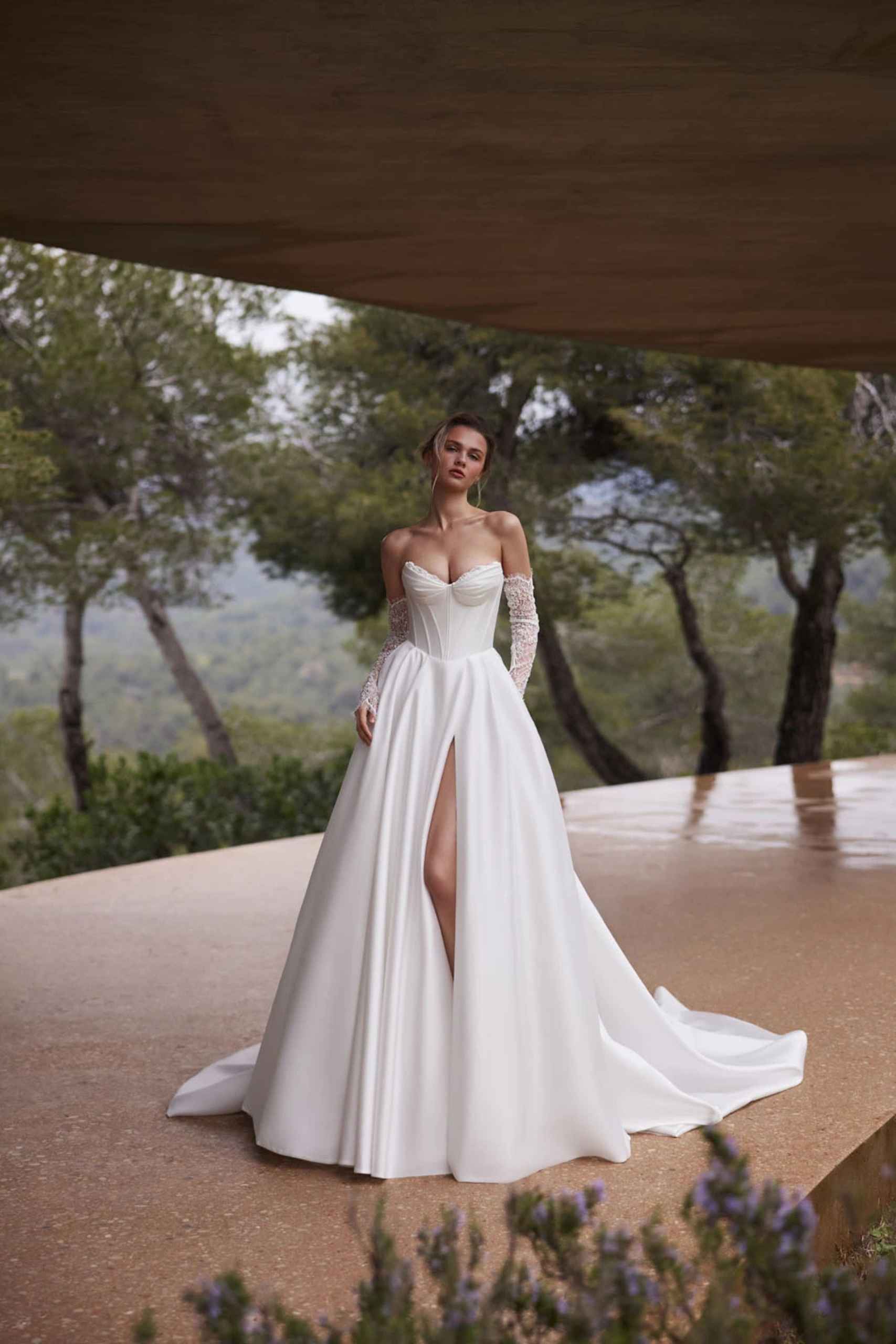 Poluprozirni čipkasti rukavi dodaju romantičan dodir i mogu se ukloniti, a zatvaraju se diskretnim patentnim zatvaračem. Profinjena draperija i čipkasti detalji krase gornji dio haljine, naglašavajući njezinu eleganciju. Korzet s vezanjem oblikuje struk i osigurava savršeno pristajanje, stvarajući besprijekorno definiranu siluetu.