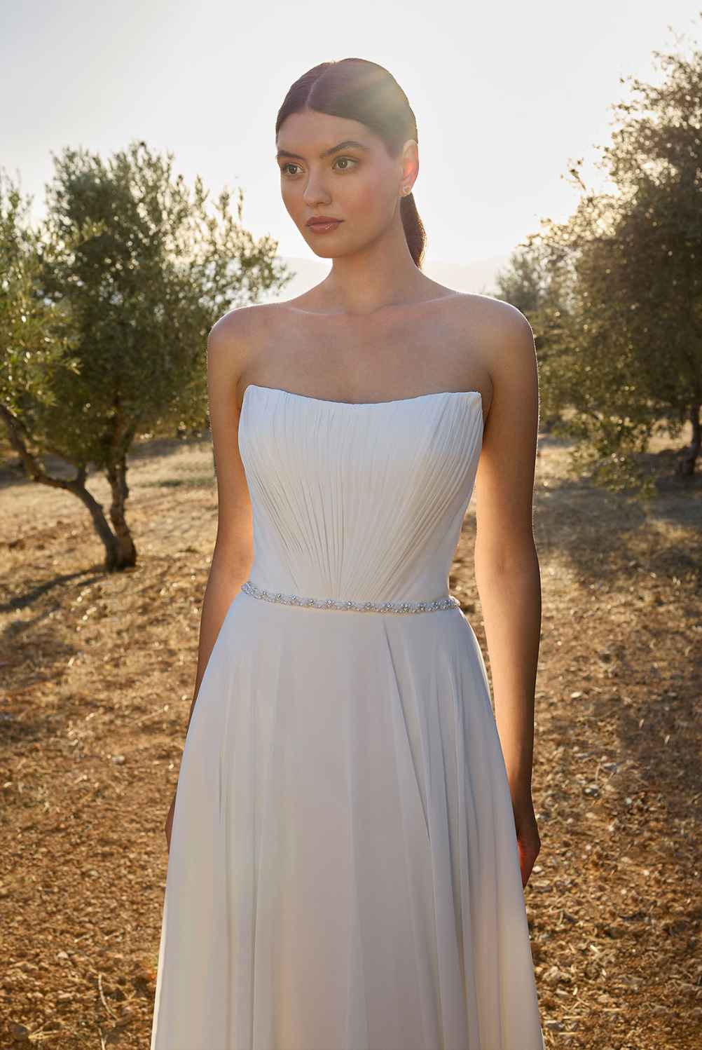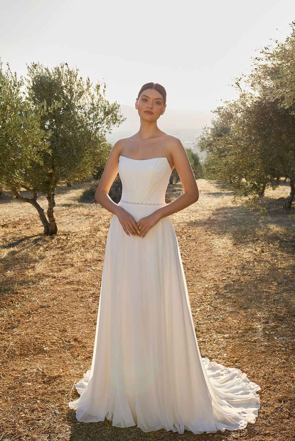 Odišući elegancijom i nježnim plisiranim detaljima, ova vjenčanica ističe se modernim dekolteom i lepršavom siluetom koja graciozno prati svaki pokret.