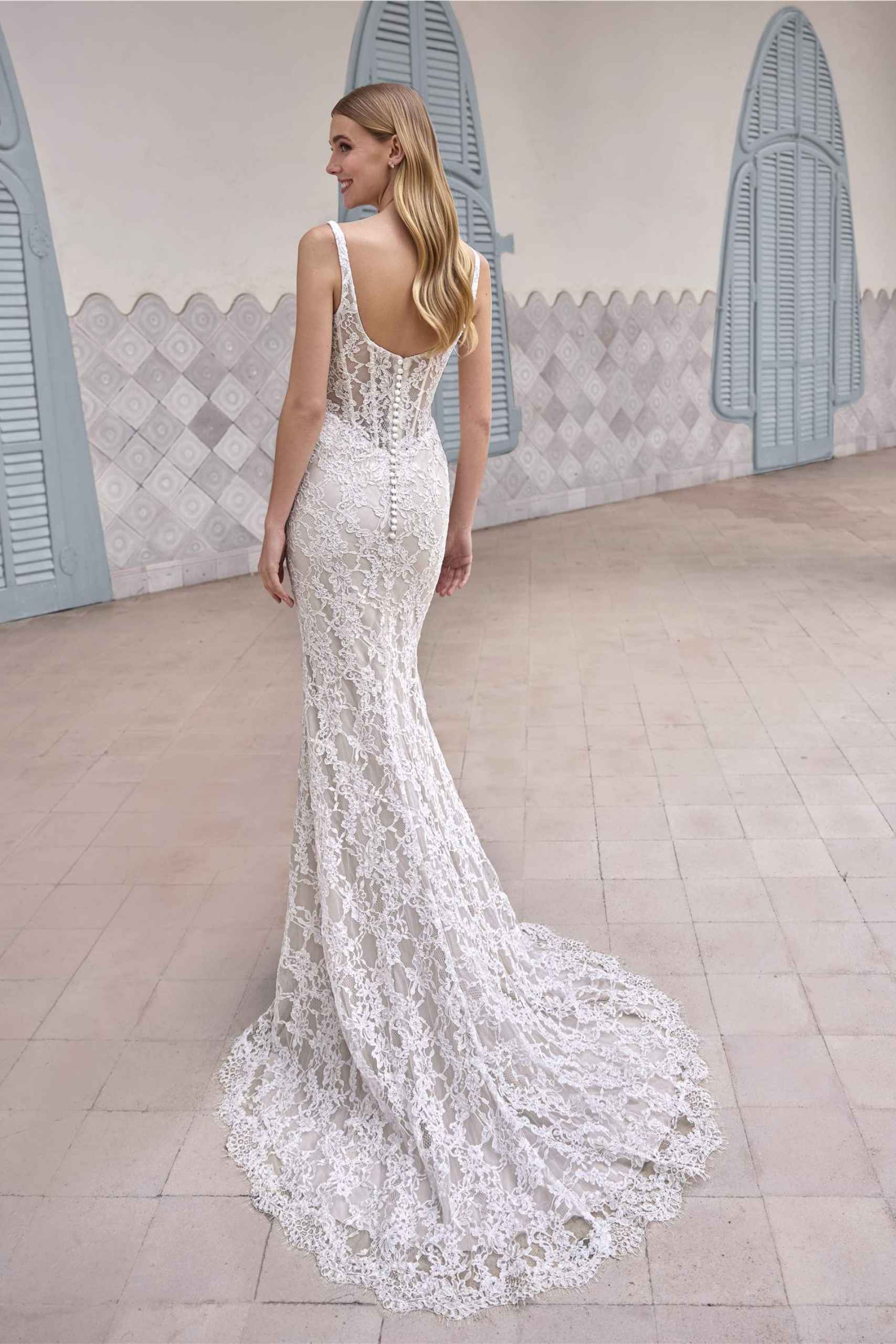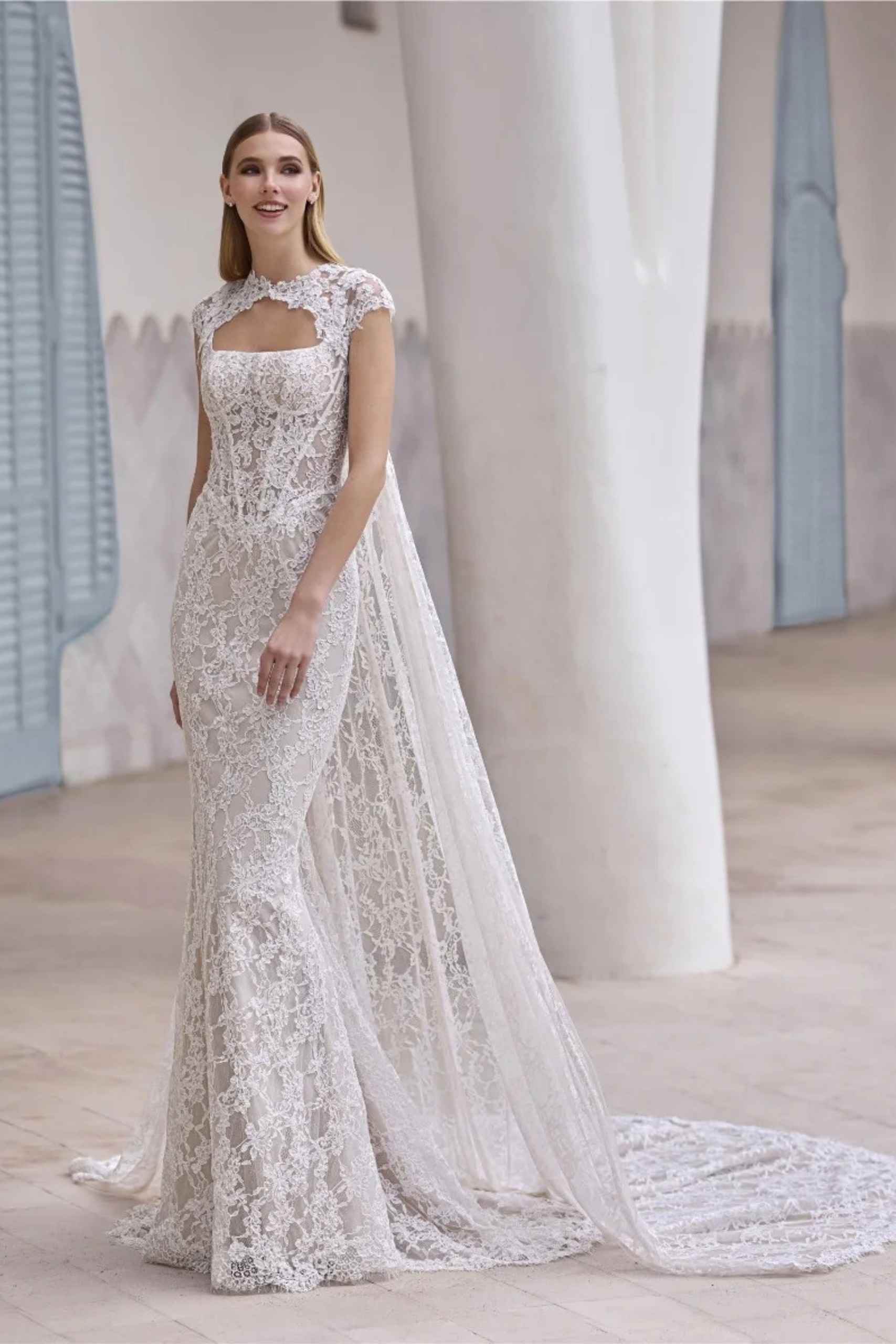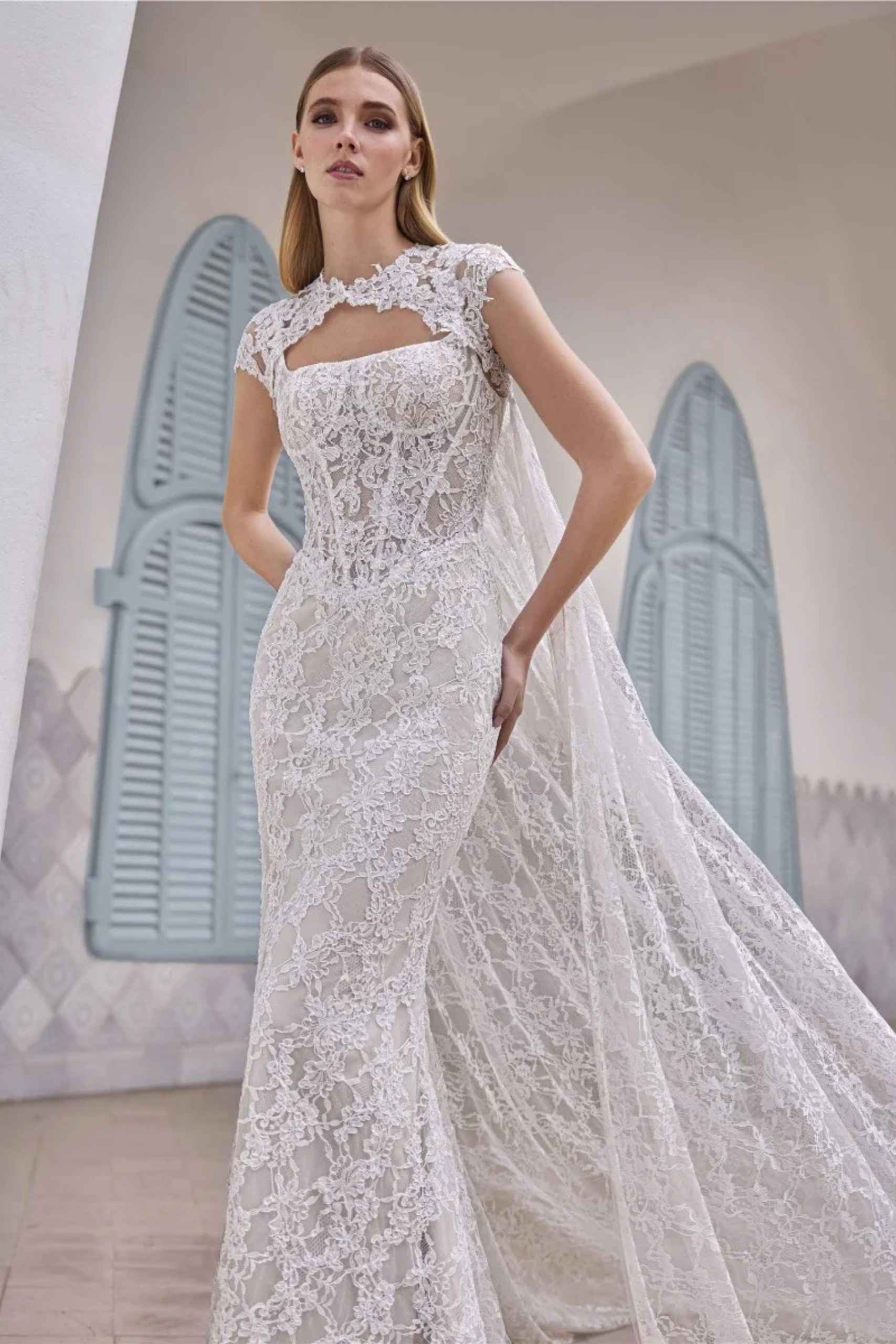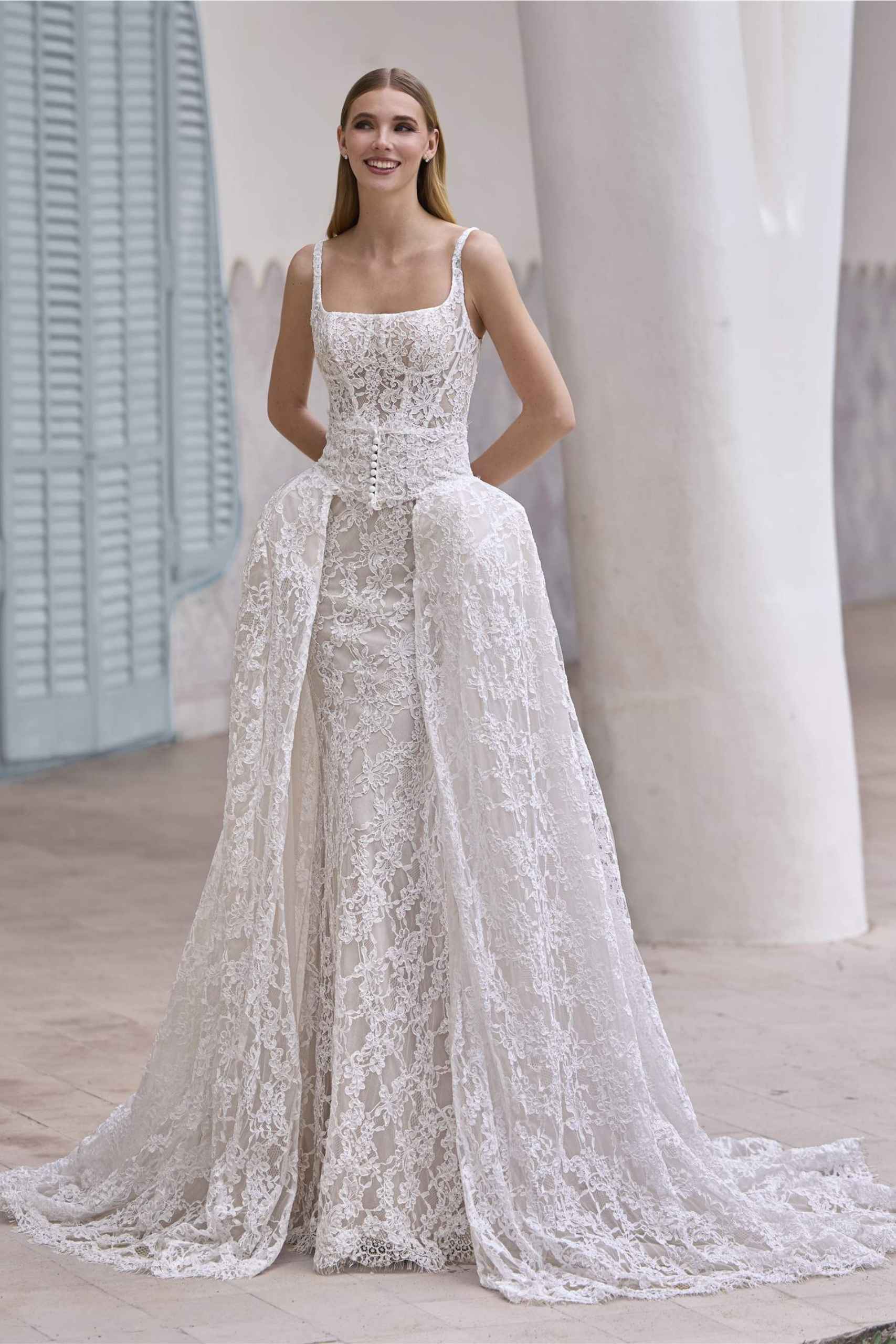 Ova vjenčanica sirena kroja s četvrtastim dekolteom upotpunjena je voluminoznom odvojivom suknjom, stvarajući savršen kontrast između čistih linija i dramatičnog efekta. Izrađena od profinjene chantilly čipke, ona je sofisticiran izbor koji omogućuje prilagodbu u svakom trenutku – od elegantne ceremonije do glamurozne večernje proslave.