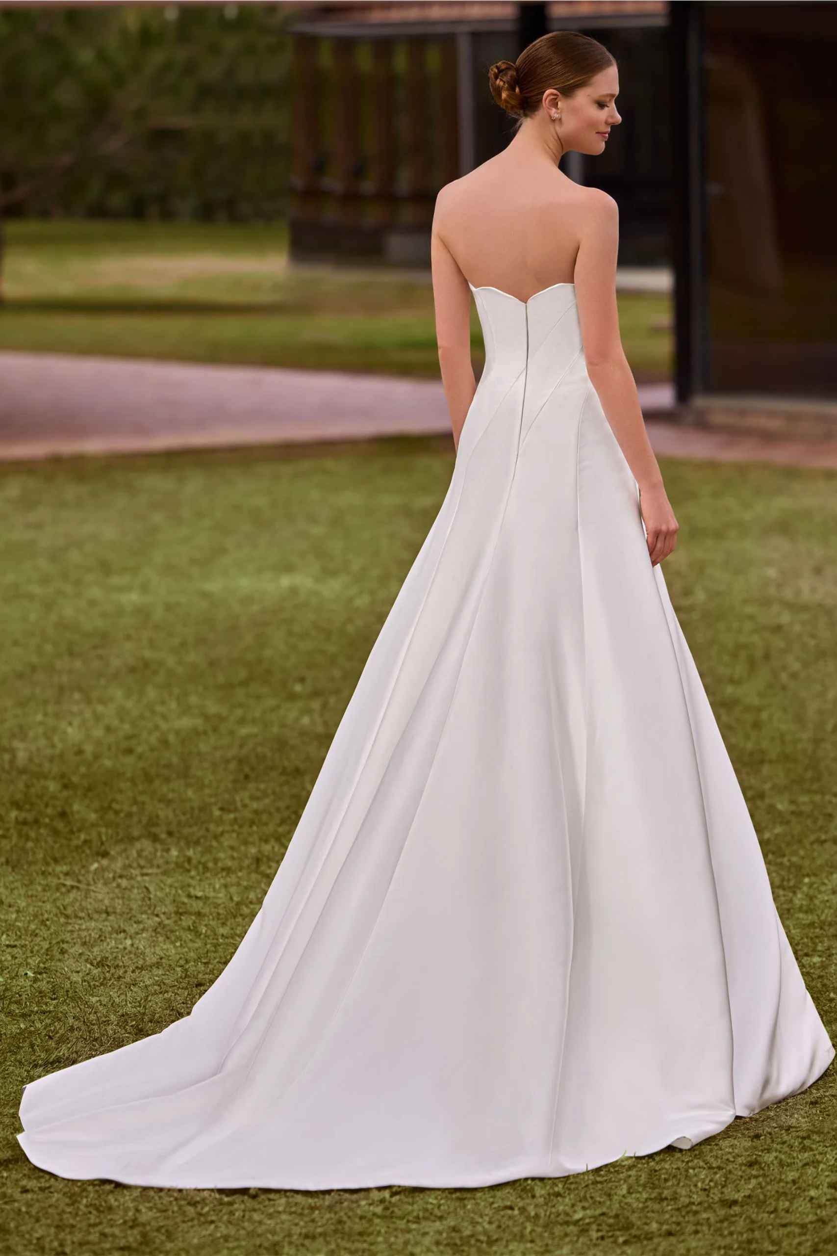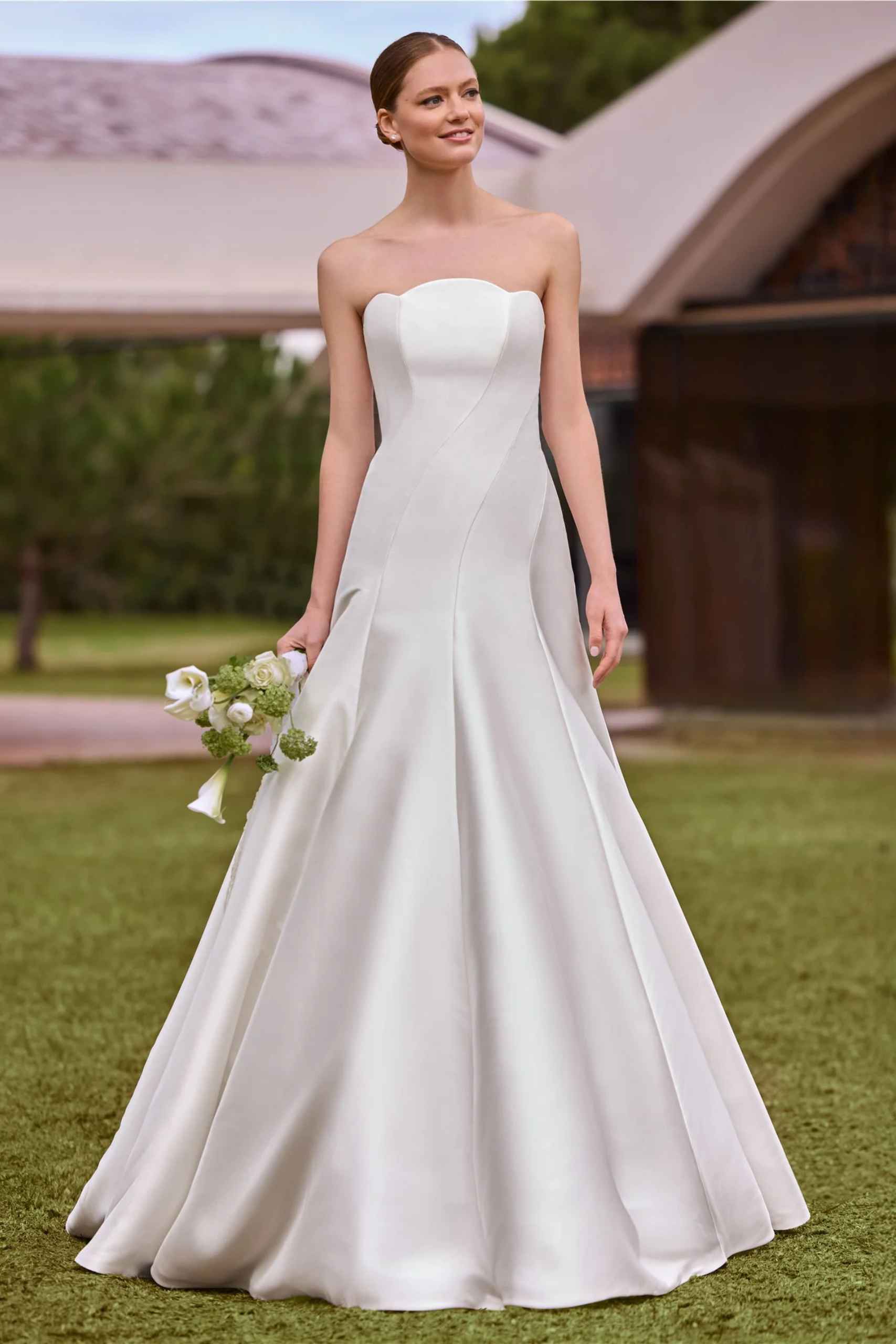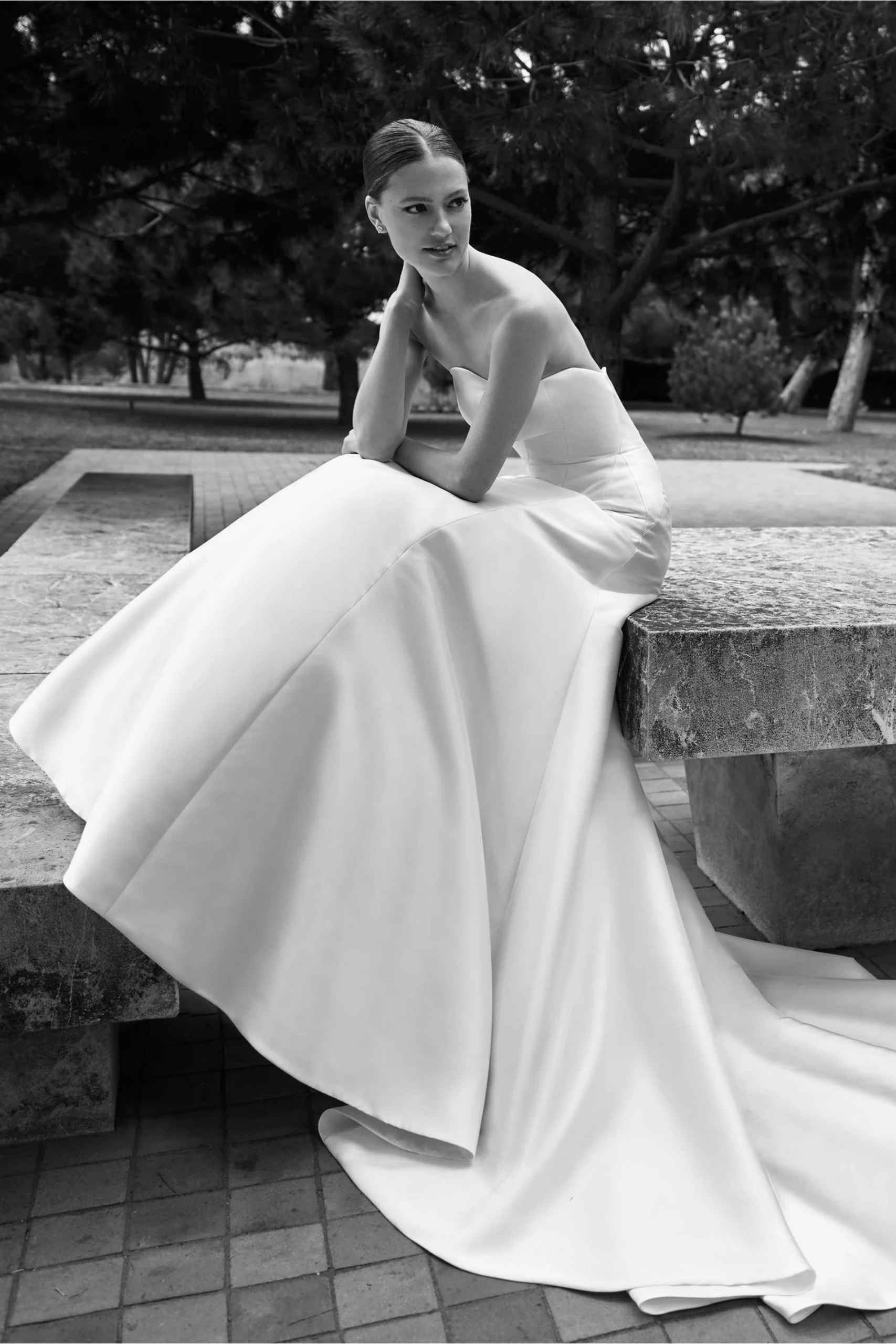 Izrađena od glamuroznog mikada, ova vjenčanica sirena kroja bez naramenica, ističe se zaobljenim šavovima koji naglašavaju konstrukciju i oblik siluete, dok voluminozna suknja dodaje dinamiku i raskoš. Silueta je istovremeno strukturirana i lepršava, savršena za mladenku koja traži sofisticiranost i bezvremensku eleganciju.