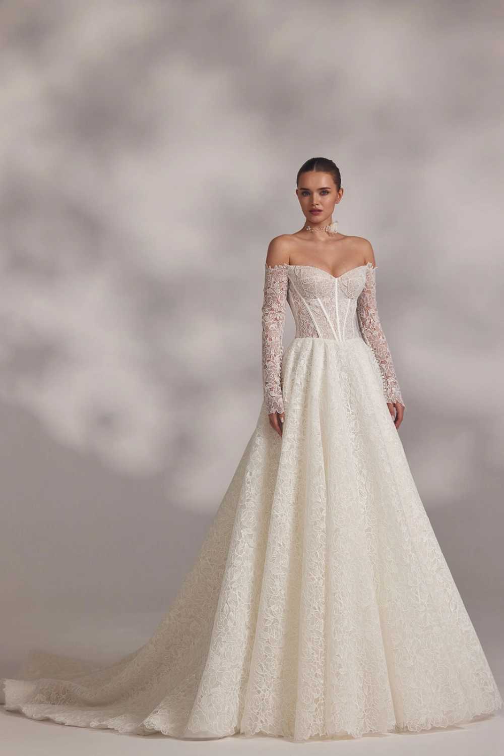 Abril – haljina s korzetom sašivena od romantične cvjetne čipke, glatkim srcolikim izrezom te dugim rukavima, lađa izreza.