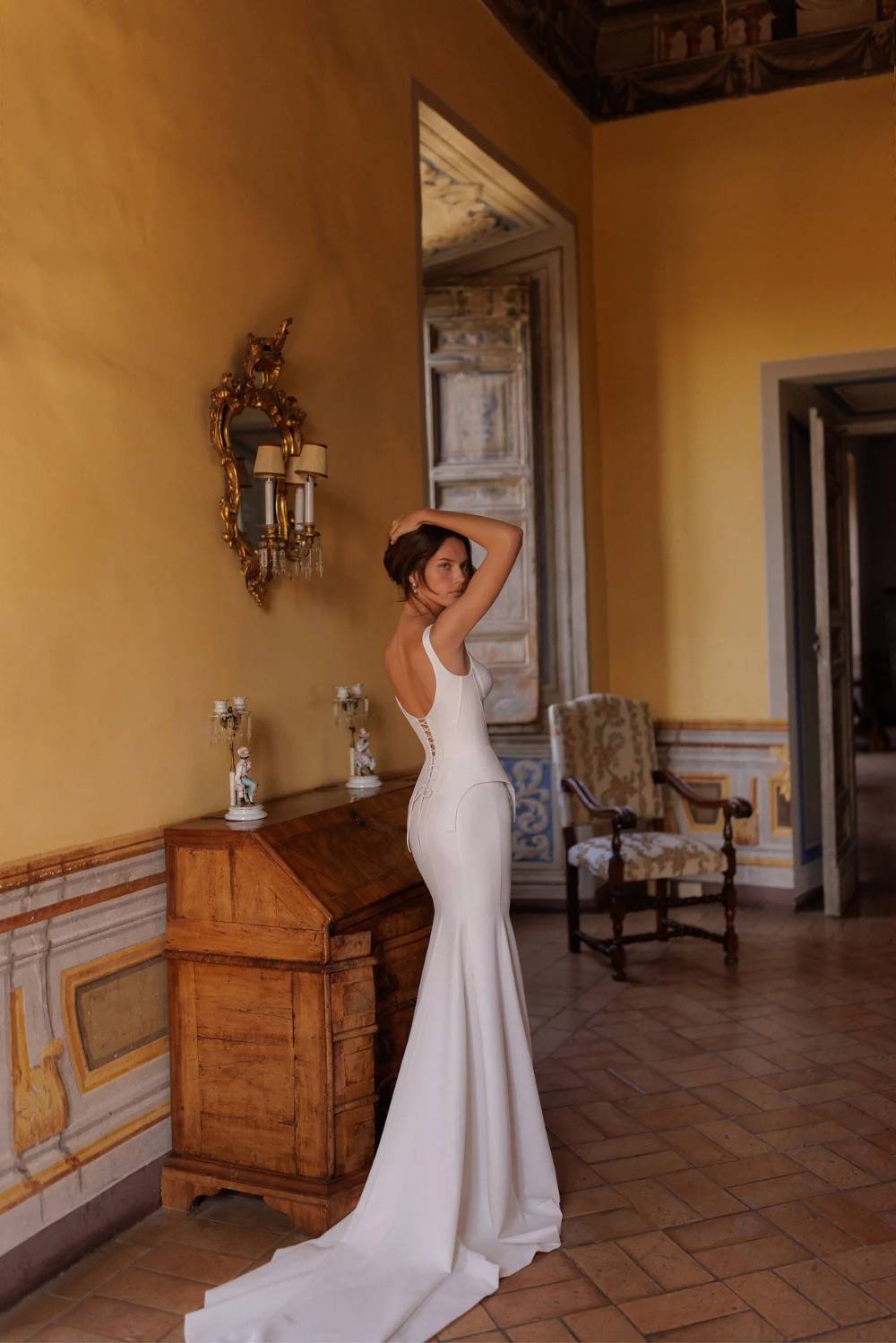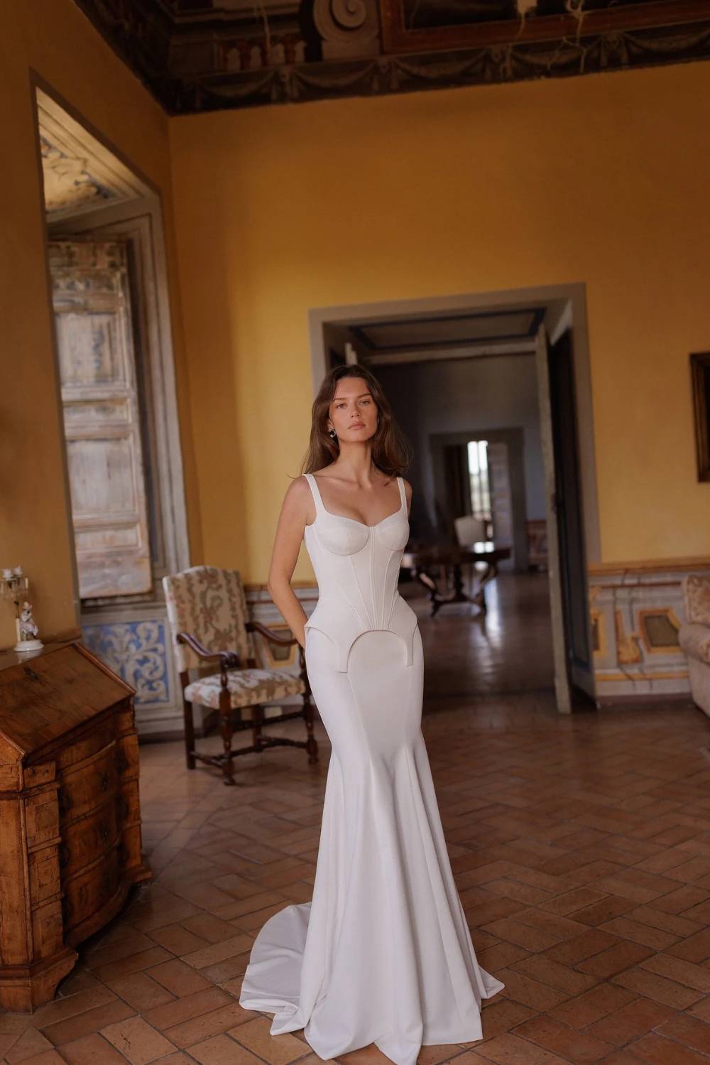Izduženi korzet s naramenicama, glatkim špičastim izrezom i profinjenim detaljima, uz glatku suknju sirena kroja.