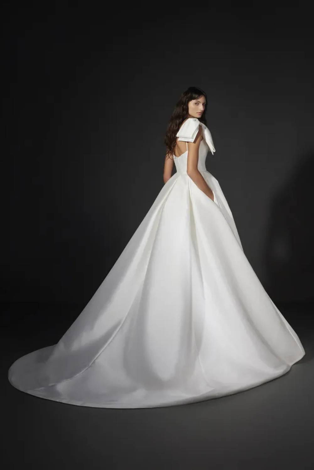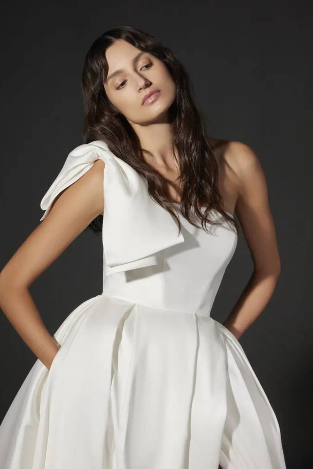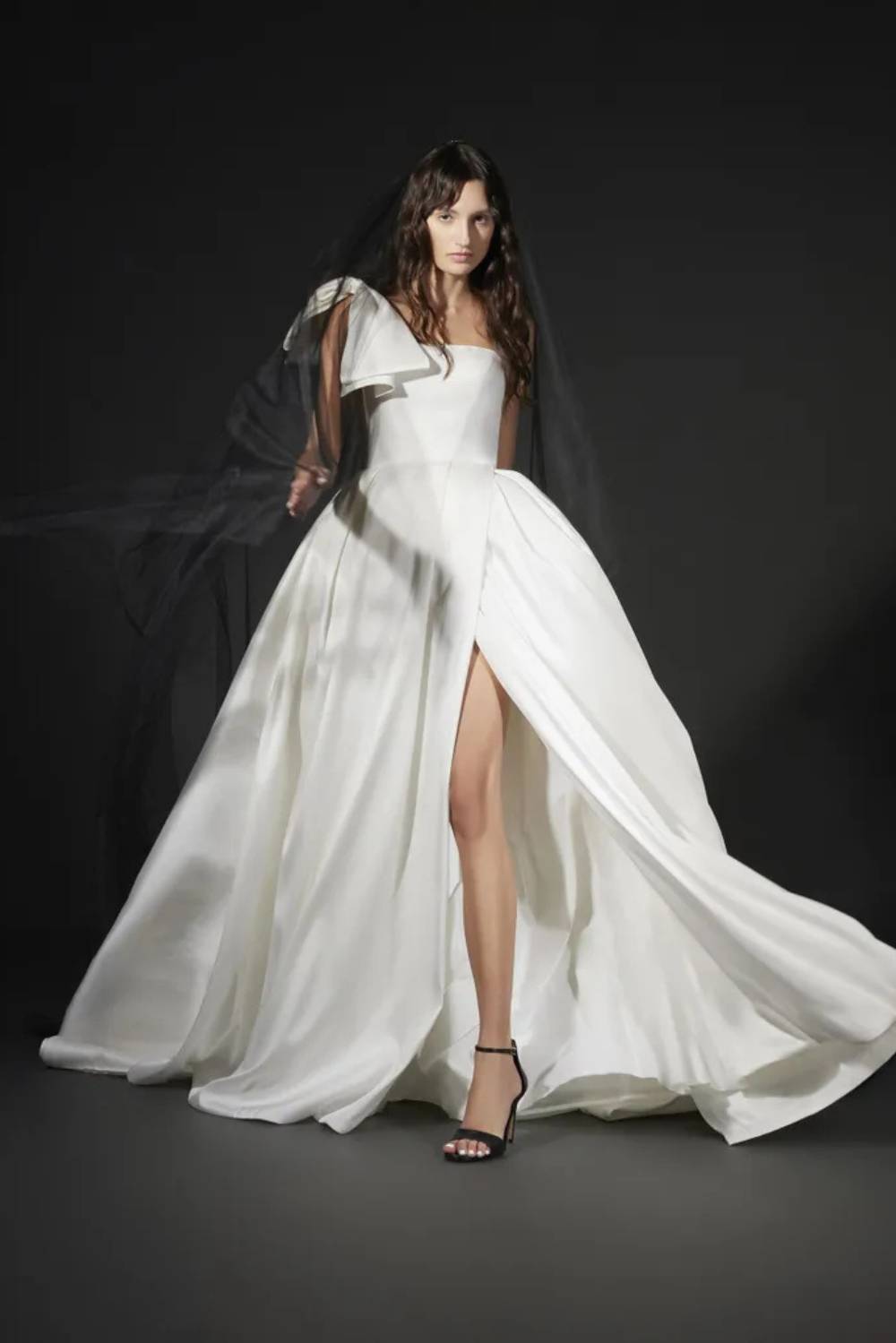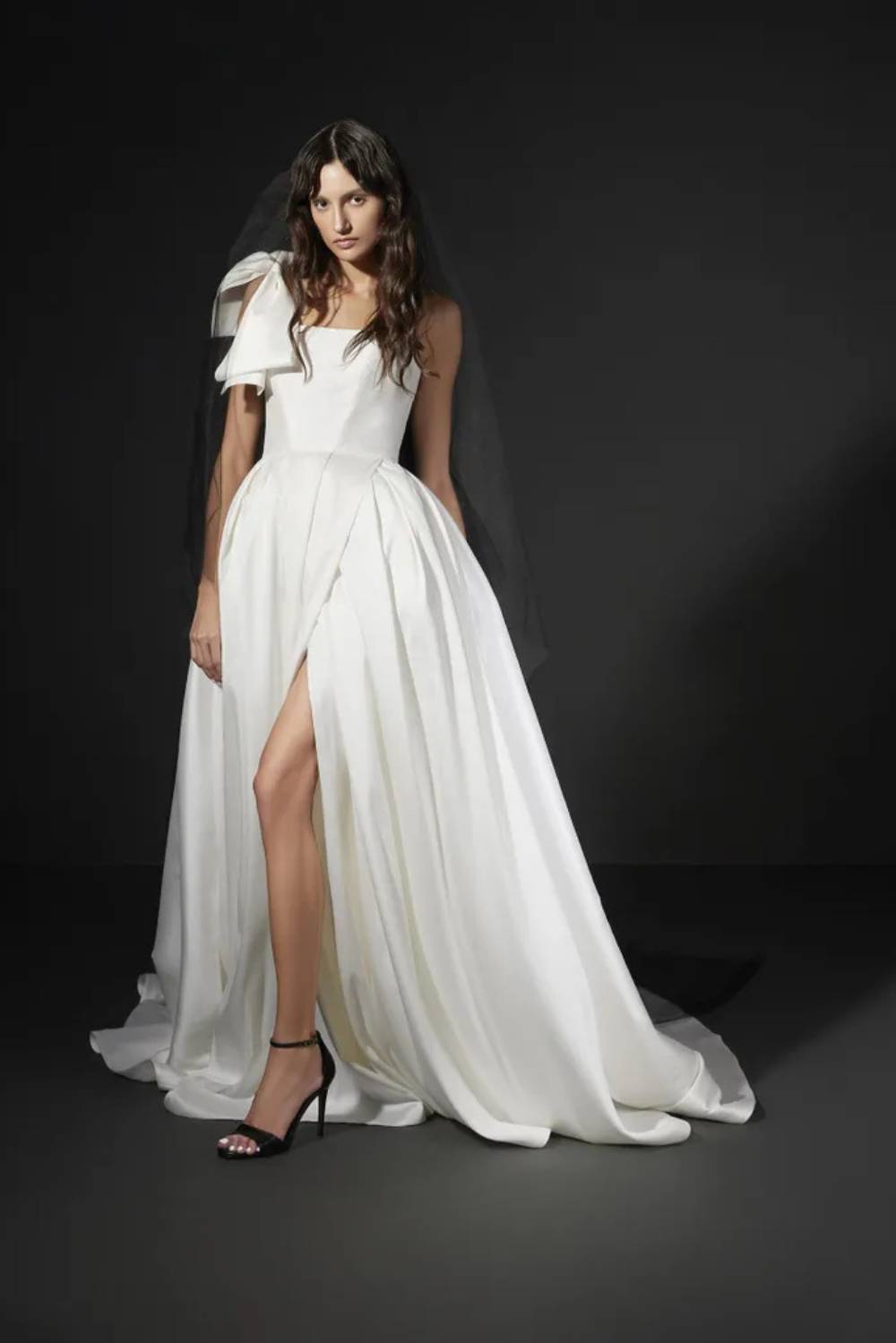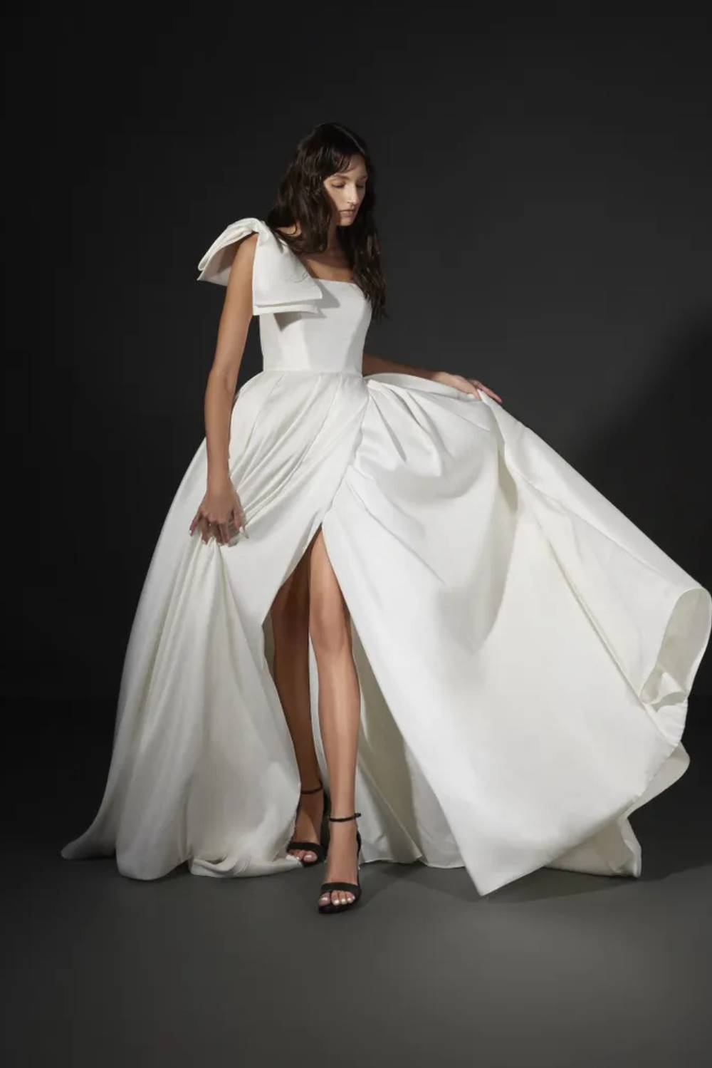 Vjenčanica princeza kroja od mikado tkanine, asimetričnog izgleda sa prorezom za nogu.